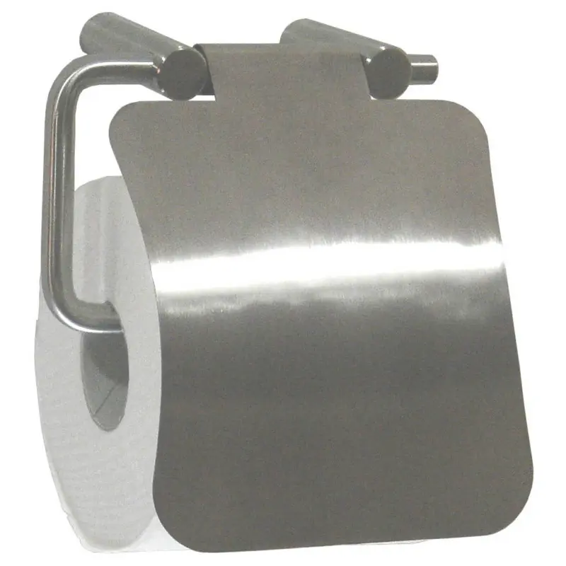 Держатель туалетной бумаги с крышкой из сатинированной нержавеющей стали AISI 304 для настенного монтажа. Изготовлен из высококачественной нержавеющей стали, устойчивой к ржавчине и коррозии, что обеспечивает высокую прочность и долговечность. Подходит для гостиничного бизнеса, для оснащения ванных комнат в гостиничных номерах и для общественного пользования. Два крепления к стене из нержавеющей стали AISI 304 толщиной 0,8 мм гарантируют правильную фиксацию держателя туалетной бумаги. Крышка держателя туалетной бумаги также изготовлена из нержавеющей стали AISI 304 толщиной 0,8 мм. Цилиндрический вал для рулона изготовлен из нержавеющей стали AISI 304, диаметр 9,8 мм. Не имеет съемных деталей. Обычно комплектуется кольцом или полотенцедержателем из нержавеющей стали. Винты и дюбели для крепления к кирпичной стене входят в комплект поставки.