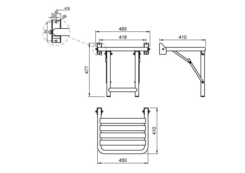 Сиденье для душа сделано из нержавеющей стали AISI 304, что гарантирует невосприимчивость к коррозии и ржавчине. Сиденье оборудовано двумя ножками для дополнительной опоры и прочности, что позволяет ему выдерживать нагрузки до 120 кг.