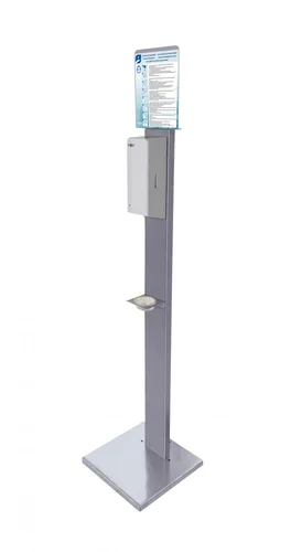Благодаря современному дизайну, мобильная стойка отлично впишется в интерьеры разных стилей. В качестве дезинфекции рук возможно использование антисептического геля или жидкого кожного антисептика.