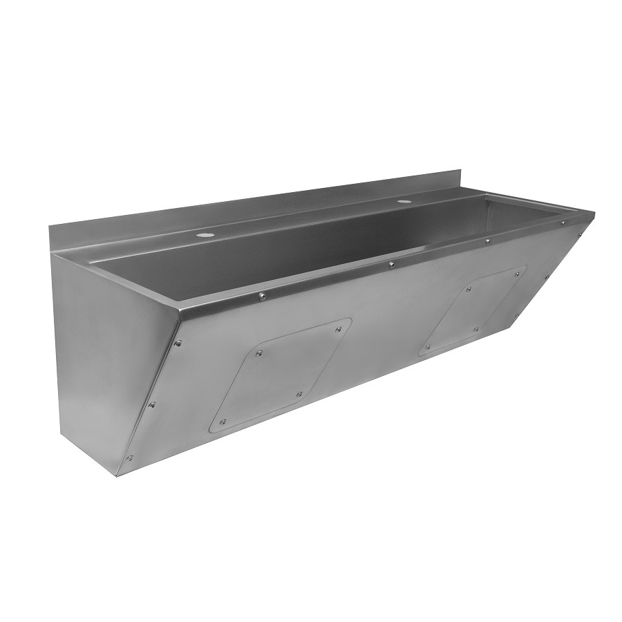 Коллективная умывальная чаша, рассчитанная на двоих пользователей, изготовлена в форме лотка из прочной нержавейки стандарта AISI 304. Верхний слой изделия подвергнут тщательной шлифовке, обладает привлекательным матовым покрытием. Канализационное отверстие расположено справа.