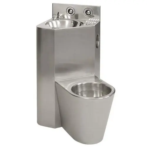 Антивандальный угловой комплект Sanela: напольный унитаз с раковиной прекрасно подойдет для установки в исправительных и психиатрических учреждениях. Изделие изготовлено из нержавеющей стали CrNi 18/10 (AISI-304), данный материал долговечен и обладает высокой механической прочностью.