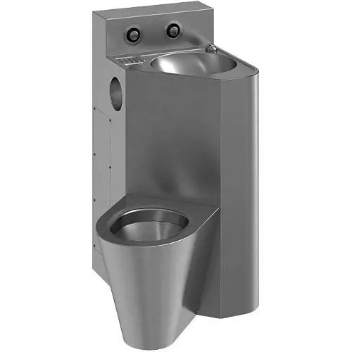 Антивандальный туалетный угловой комплект Sanela: напольный унитаз с раковиной прекрасно подойдет для установки в исправительных и психиатрических учреждениях. Изделие изготовлено из нержавеющей стали CrNi 18/10 (AISI-304), данный материал долговечен и обладает высокой механической прочностью.
