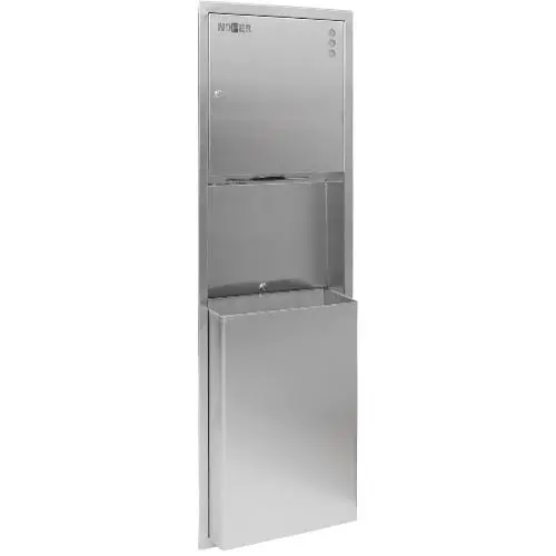 Компактный встраиваемый блок с диспенсером для бумаги и съёмным контейнером для мусора. Безопасный корпус, без острых углов. Сделан из нержавеющей стали AISI 304. Размеры (при установке): 1334 х 400 х 118 (мм). Емкость диспенсера для полотенец-700 шт. Емкость контейнера-45 литров