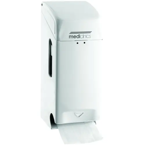 Модель предназначена для санузлов с большой проходимостью людей. Диспенсер изготовлен из стали покрыт белой эпоксидной смолой. Обладает антивандальными свойствами - anti-вандализма, что важно при установки в места с большой проходимостью. Корпус сделан из твердой стали и имеет замок безопасности Mediclinics со стандартный с ключом, который обеспечивает доступ к замене туалетной бумаги. Окошечко сбоку модели, позволяет видеть количество оставшейся бумаги внутри, ось для рулона бумаги оборудована тормозом инерции для оптимальной подачи бумаги, без лишнего раскручивания.