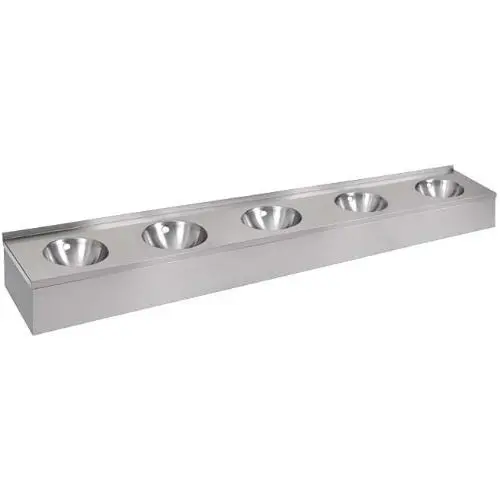 Подвесной умывальник Sanela 93617 (SLUN61P) с 5 чашами предназначен для установки в различных общественных и производственных помещениях, в том числе на предприятиях пищевой промышленности, для мытья рук персонала. Эта модель оснащена переливным отверстием, которое предотвращает перелив воды за пределы краёв раковины. Изделие изготовлено из нержавеющей стали CrNi 18/10 (AISI-304), которая делает его надёжным и долговечным для использования.