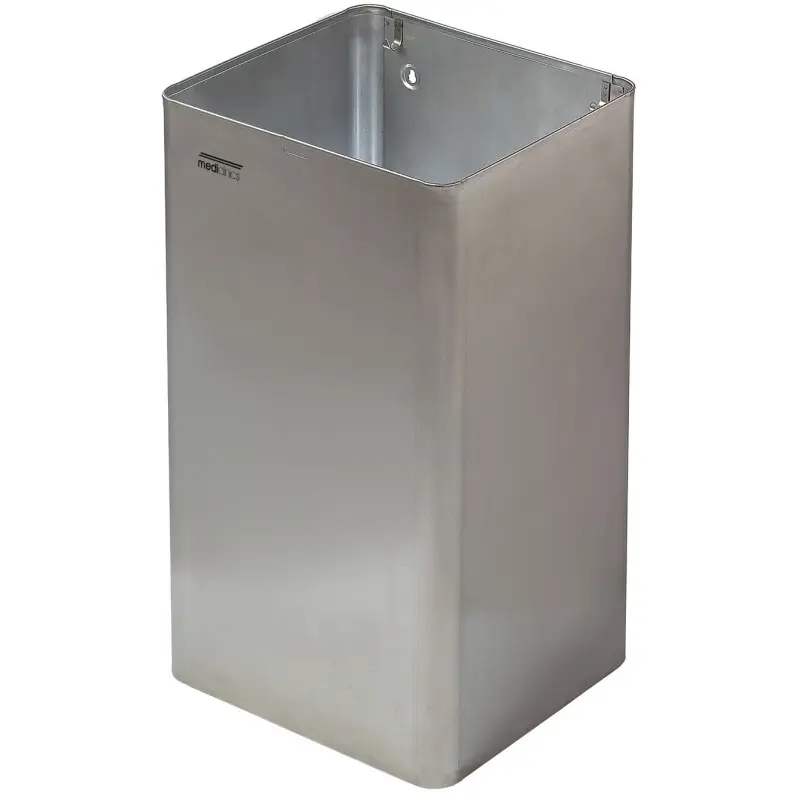 Контейнер для отходов без крышки, емкостью 65 л, изготовлен из цельного материала, полностью герметичен. Устанавливается на полу или на стене с помощью 2 отверстий, просверленных на задней стенке прибора. Подходит для туалетов и внутренних общественных помещений с очень высокой проходимостью. Модель подходит для общественного пользования.