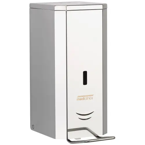 Настенный порционный дозатор дезинфицирующего средства Mediclinics DJSP036C. Снабжен рычагом для подачи дезинфицирующего средства. Предназначен для установке в местах с повышенными санитарными требованиями больницы, хирургии, медицинские учреждения