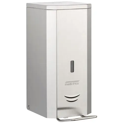 Настенный порционный дозатор дезинфицирующего средства Mediclinics DJSP036CS. Снабжен рычагом для подачи дезинфицирующего средства. Предназначен для установке в местах с повышенными санитарными требованиями больницы, хирургии, медицинские учреждения