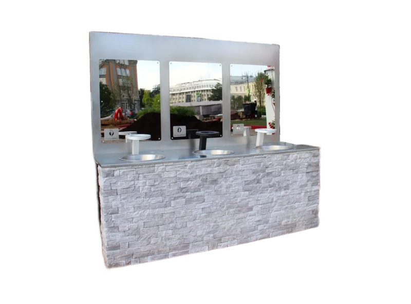 — Антивандальная конструкция модуля из нержавеющей стали с декоративной отделкой из натурального камня. — 3 стальных зеркала Sawy толщиной 1,2 мм — блок из 3 встроенных раковин Sawy. Толщина стали 1,5 мм — Смесители Nofer 3в1 - бесконтактный кран подачи воды, автоматический дозатор мыла и сушилка для рук