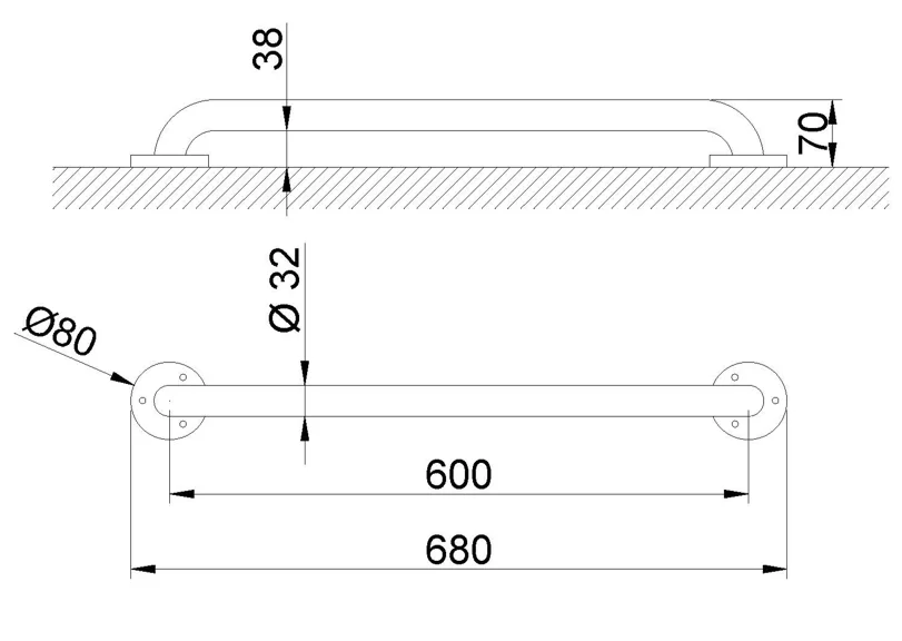 Поручень прямой опорный для крепления на стену, матовый. Подходит для поддержки в раковинах, туалетах, душах и ваннах. Предназначен для людей с ограниченными возможностями. Изготовлен из нержавеющей стали AISI 304. Две опорные точки. Длина (между центрами опор): 600 мм. Диаметр Ø 32 мм, толщина 1,5 мм. 38 мм от стены. Рекомендуемая высота установки 70-75 см от пола. Крепления включены в комплект.