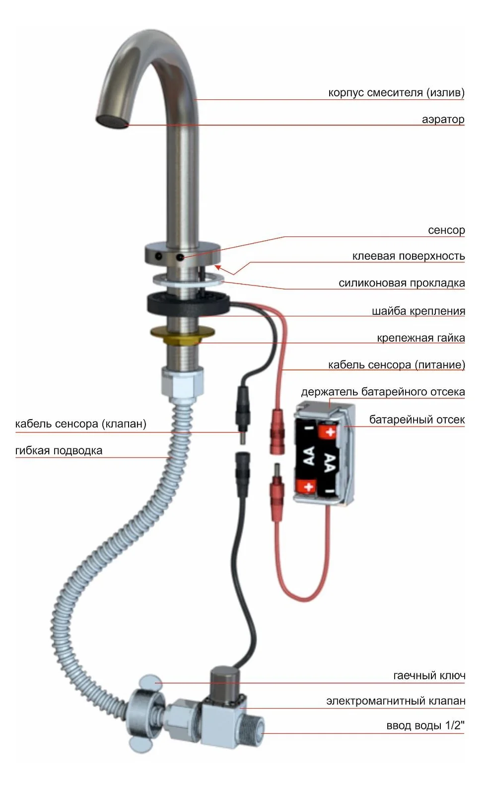 Излив в сборе с сенсором (смеситель) - 1 шт. Электромагнитный клапан - 1 шт. Гибкая подводка с гаечным ключом - 1 шт. Батарейный отсек с держателем - 1 шт. Силиконовая прокладка с шайбой крепления - 1 шт. Комплект крепления для держателя батарейного отсека - 1 шт. Кабель USB - 1 шт. Съемный ключ для аэратора - 1 шт. Паспорт изделия с гарантийным талоном - 1 шт.
