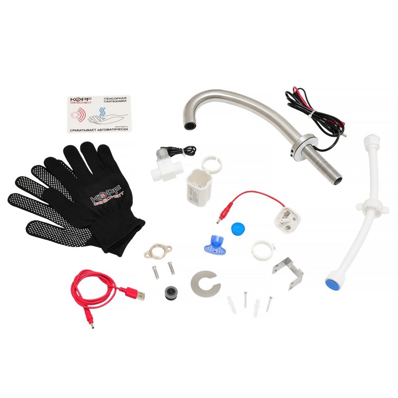 Излив в сборе с сенсором (смеситель) - 1 шт. Электромагнитный клапан - 1 шт. Батарейный отсек с держателем - 1 шт. Силиконовая прокладка с шайбой крепления - 1 шт. Прижимная гайка - 1 шт. Комплект крепления для держателя батарейного отсека - 1 шт. Кабель USB - 1 шт. Съемный ключ для аэратора - 1 шт. Прокладка (1/2 дюйма) - 1 шт. Паспорт изделия с гарантийным талоном - 1 шт.