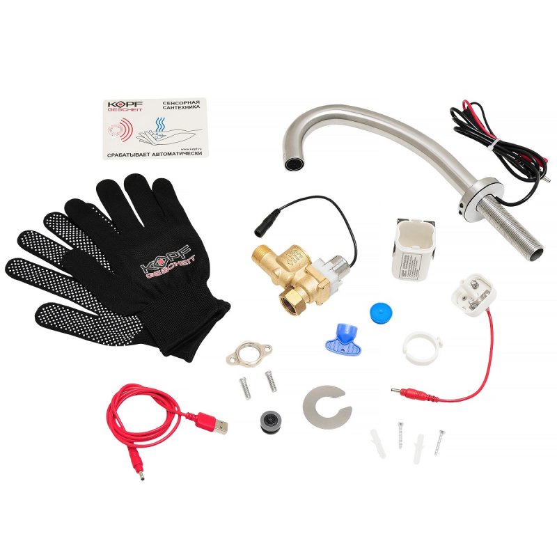 Излив в сборе с сенсором (смеситель) - 1 шт. Электромагнитный клапан с функцией EasyCare и встроенным фильтром тонкой очистки - 1 шт. Батарейный отсек с держателем - 1 шт. Силиконовая прокладка с шайбой крепления - 1 шт. Прижимная гайка - 1 шт. Комплект крепления для держателя батарейного отсека - 1 шт. Кабель USB - 1 шт. Съемный ключ для аэратора - 1 шт. Прокладка (1/2 дюйма) - 1 шт. Паспорт изделия с гарантийным талоном - 1 шт.