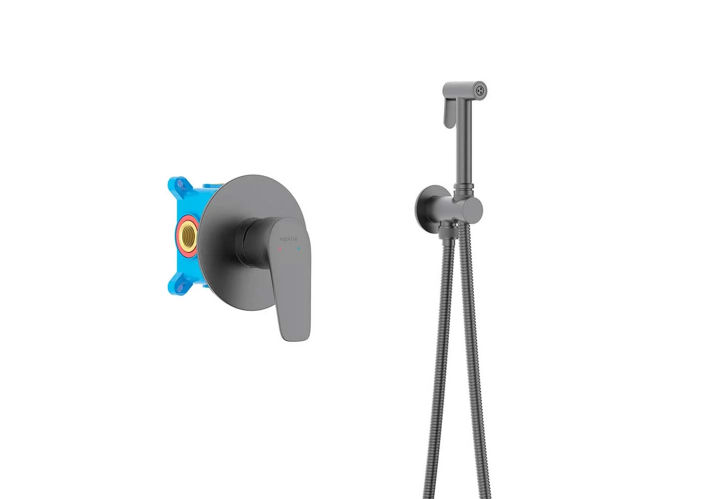 AQ1119BGM БЕТТА — набор с гигиеническим душем, оружейная сталь Комплект включает: смеситель (внешняя и скрытая часть), гигиеническую лейку, шланг 120 см, шланговое подсоединение с держателем. Материал — латунь с покрытием "оружейная сталь" (шлифованный черный хром), скрытый настенный монтаж, 1 монтажное отверстие, стандарт подводки 1/2". Керамический картридж обеспечивает плавное управление и долговечность, рычажное управление удобно для быстрого регулирования напора и температуры. Совместим с современными сантехническими системами, подходит для жилых и коммерческих объектов. Преимущества: минималистичный дизайн, устойчивость к коррозии и царапинам, легкая очистка, полный монтажный комплект.