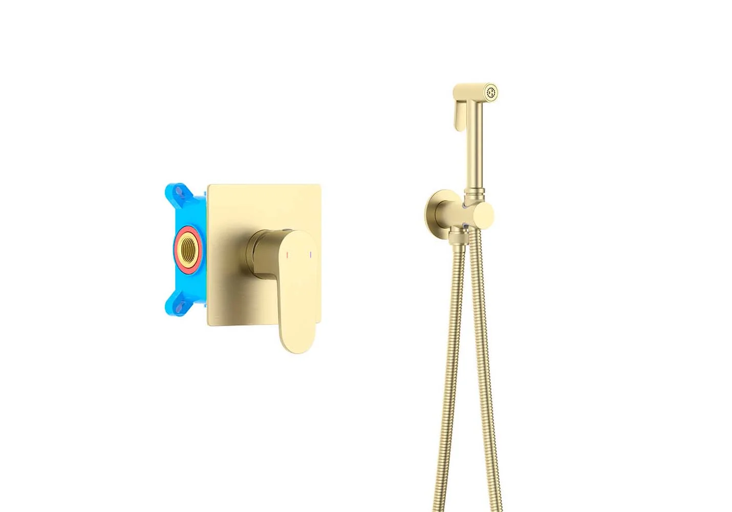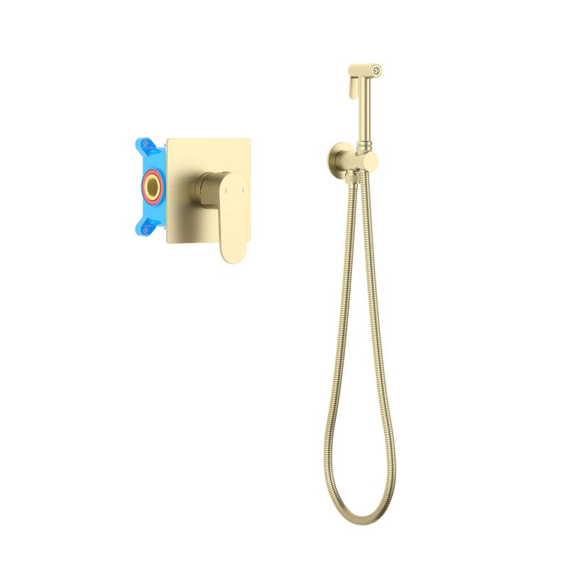 AQ1219BG ОБЕРОН набор с гигиеническим душем, шлифованное золото Комплект Aquatek ОБЕРОН AQ1219BG — профессиональное решение для организации гигиенического душа в санузлах любого уровня. Включает однорычажный смеситель (внешняя и скрытая часть), латунную гигиеническую лейку, держатель, шланг из нержавеющей стали длиной 1,2 м и шланговое подсоединение. Технические характеристики: ⦁ Материал: латунь (смеситель, лейка, держатель), шланг — нержавеющая сталь SUS304 ⦁ Покрытие: шлифованное золото, устойчивое к истиранию и коррозии ⦁ Управление: однорычажное, керамический картридж ⦁ Монтаж: скрытый, стандарт подводки 1/2" ⦁ Размеры: ширина 120 мм, высота 144 мм ⦁ Гарантия: 10 лет Преимущества и особенности: ⦁ Полный монтажный комплект, не требует дополнительных покупок ⦁ Европейские комплектующие, надежная латунная конструкция ⦁ Совместимость с большинством стандартных систем водоснабжения ⦁ Легкая интеграция в современные интерьеры благодаря премиальному покрытию ⦁ Удобство эксплуатации и обслуживания, долговечность Область применения: Рекомендуется для жилых и коммерческих санузлов, где важны эстетика, надежность и функциональность. Подходит для установки рядом с унитазом или биде.