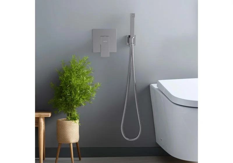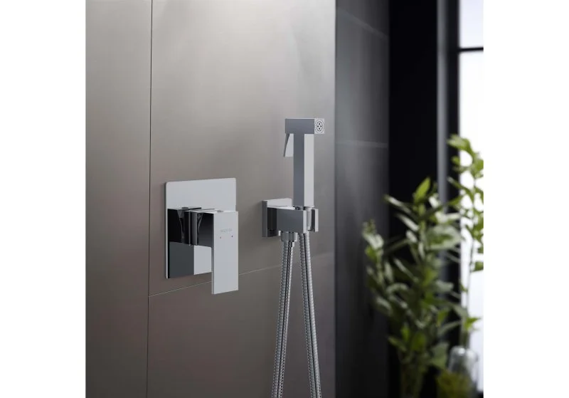 1. Смеситель для душа (внешняя и скрытая часть) 2. Душевой гарнитур: гигиеническая лейка, шланг, шланговое подсоединение с держателем 3. Декоративные накладки на стену из нержавеющей стали 3 мм