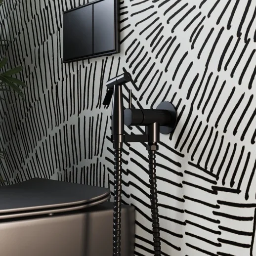 Встраиваемый смеситель с гигиеническим душем для ванной или санузла с современным минималистичным дизайном; подходит для скрытого монтажа в стену, идеален для гигиенических процедур в квартирах или домах. Создаёт цельный ансамбль с другими моделями Isola; чёрный брашированный вписывается в лофт, индустриальный или хай-тек стиль с матовой текстурой.
