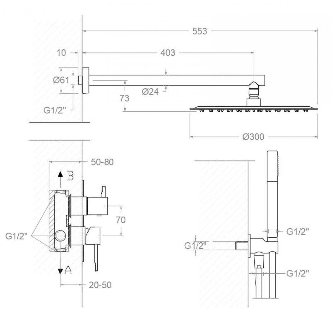 Встраиваемый смеситель для душа на 2 выхода с тропическим и ручным душем ODISEA K3915122
