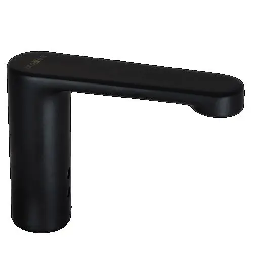 Автоматический водопроводный кран для умывальника черного цвета. Установка на столешницу с автоматической системой активации через встроенный в нее инфракрасный датчик Работа от сети 220 В 50/60 Гц или от 4 батареек АА, обеспечивающих 6 В в случае сбоя питания. Расход 6 л / мин при давлении 3 бара Материал: хромированная латунь CW617N Размеры: 142 высота x 49 ширина x 183 глубина (мм)