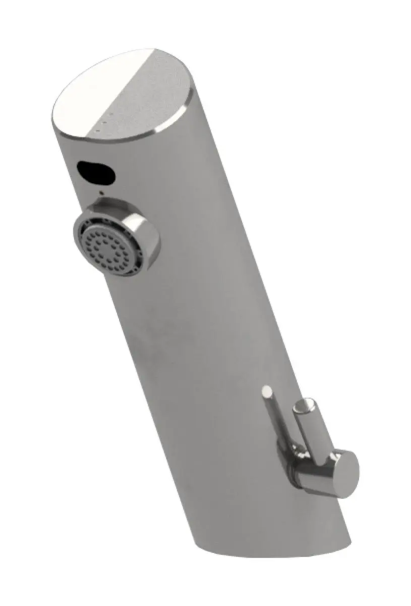 Смеситель сенсорный для установки на раковину или столешницу изготовлен их хромированной латуни и оборудован лазерным сенсором. В комплекте с устройством поставляются подводки для воды 1/2. Питание от батареек или от сети.
