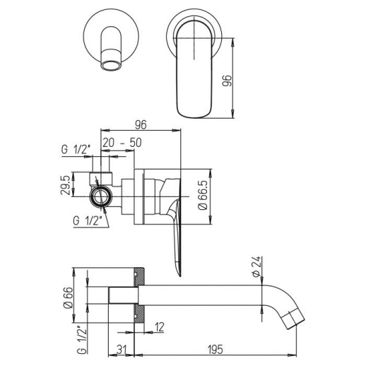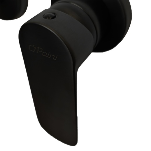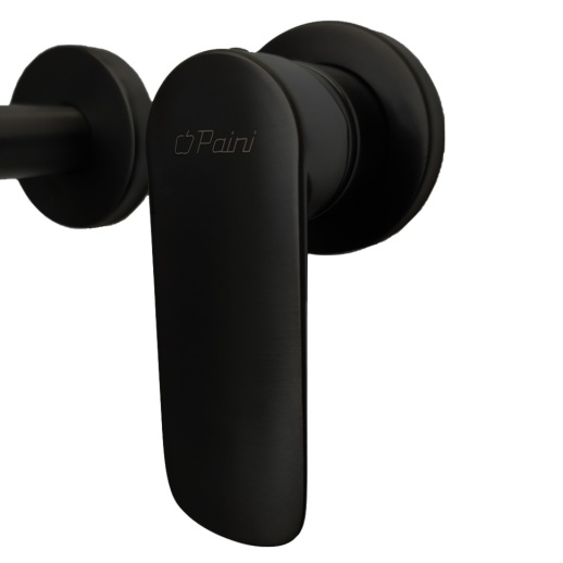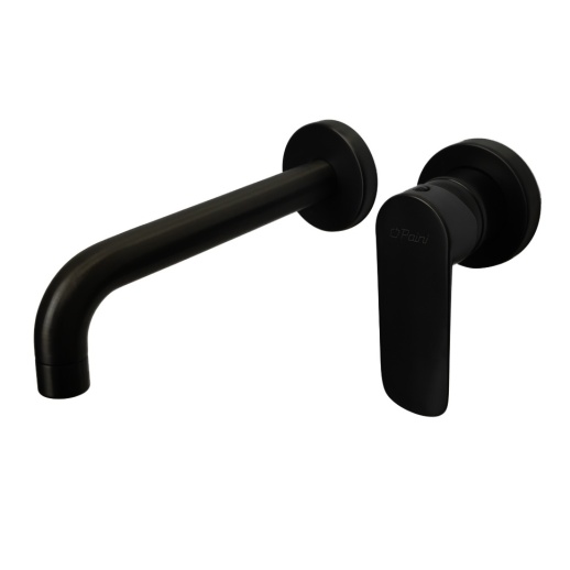 Однорычажный встраиваемый смеситель из латуни с матовым черным покрытием (порошковая окраска с эпоксидными смолами для устойчивости к царапинам), керамический картридж Nuovo Galatron 30 мм для плавной регулировки температуры и напора. Габариты: длина излива 19.5 см, высота ~9.6 см; стандарт подводки G 1/2" (жесткая), фиксированный излив, аэратор Neoperl для насыщения струи кислородом и экономии воды. Производство Paini (Италия), гарантия 5 лет, вес ~1.6 кг, монтаж на 2 отверстия в стену (скрытый).