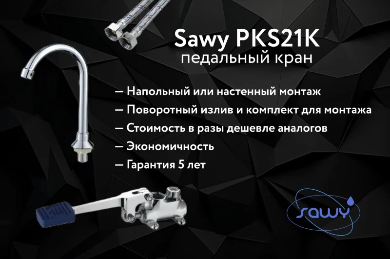 Педальные смесители и краны SAWY используются для сокращения расхода воды в местах массового трафика пользователей и пользователей с необходимостью часто открывать и закрывать кран, а так же для предотвращения перекрестного загрязнения.