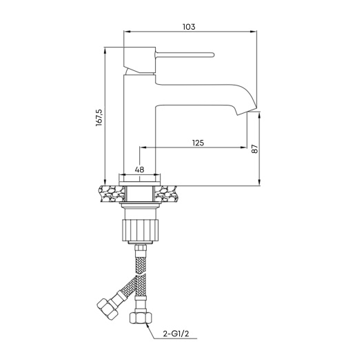 ⦁ Габариты: Длина излива 12.5 см, высота излива 8.7 см; вес ~0.8 кг; длина подводки 45 см; стандарт подводки G 1/2" (15x21), жёсткая подводка.