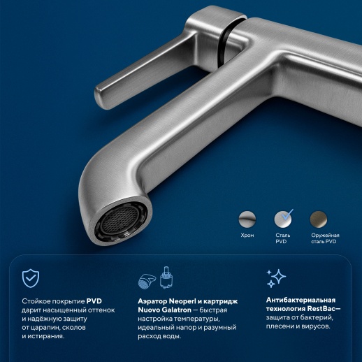 ⦁ Материал: Латунный корпус с антибактериальным покрытием RestBac® (уничтожает до 99,99% микробов); нержавеющая сталь AISI 304 с матовым PVD-покрытием в цвете сталь (брашированная поверхность, устойчиво к царапинам, коррозии и налёту в 10 раз прочнее обычных).