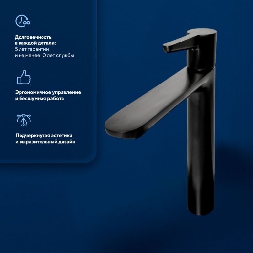 ⦁ Комфорт: Высокий излив удобен для мытья рук/лица без брызг, плавная регулировка; аэратор обеспечивает тихий поток, экономит воду.