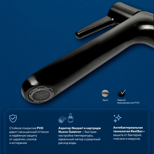 ⦁ Материал: Латунный корпус с антибактериальным покрытием RestBac® (уничтожает до 99,99% микробов); нержавеющая сталь AISI 304 с матовым PVD-покрытием в чёрном брашированном цвете (устойчиво к царапинам, коррозии и налёту в 10 раз прочнее обычных, антиизвестковое покрытие).