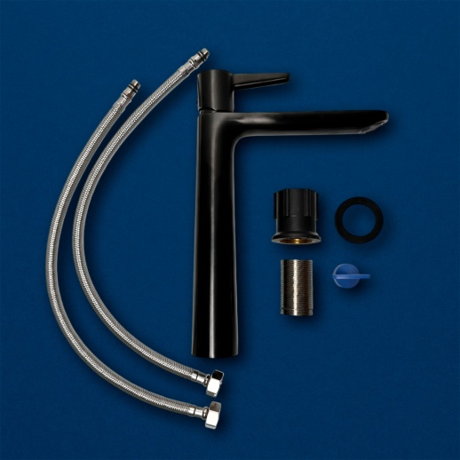 | В комплекте | Смеситель с высоким фиксированным изливом, комплект подводки, монтажный комплект, эксцентрики |