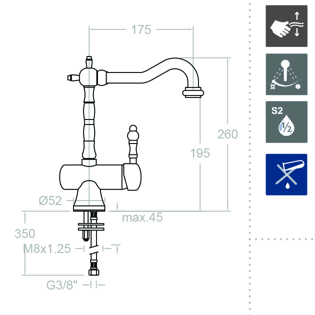 Коллекция GAUDI - коллекция, названная в честь всемирноизвестного испанского архитектора Antonio Gaudi, выполненная в классическом стиле. Все смесители коллекции GAUDI оснащены вентельными рычагами. Помимо комфорта и надежности, ramonsoler. предлагает гарантию в 5 лет на смесители и 3 года на аксессуары, поскольку мы уверены в качестве нашей продукции и даже в кризисном случае не оставим вас наедине с проблемой. ДВОЙНОЕ ХРОМИРОВАНИЕ - смеситель приобретает свой цвет в процессе присоединения к смесителю частиц хрома под электрическим током, такой вид покрытия обеспечивает высокий срок службы покрытия и высокую износостойкость. SENSIBILITY - смеситель снабжен керамическим картриджем, позволяющим сделать подбор комфортной температуры воды максимально удобным. ЭРГОНОМИЧНОСТЬ - дизайн смесителя создан так, чтобы каждый мог воспользоваться смесителем и самостоятельно ощутить весь спектр удобства. TERMOSTOP BLOCK - внутри смесителя находится настраиваемый механизм, ограничивающий температуру горячей воды, что избавляет пользователя от возможных ожогов. У смесителя настроено заводское значение. Для ухода за изделием рекомендуем использовать нейтральное мыло, мальный раствор, необразивные чистящие средства. Рекомендуем наносить чистящие средства не напрямую на изделия, а на мягкую ткань. Рекомендуем сушить изделие мягкой тканью после очистки или использования. Категорически нельзя использовать чистящие средства, содержащие кислоты (соляную, муравьиную, фосфорную, и уксусную), щелочные чистящие средства, спирт, средства для удаления накипи. Категорически нельзя использовать парогенераторные чистящие устройства. Категорически нельзя использовать абразивные материалы, такие как губки с жёсткой подкладкой.