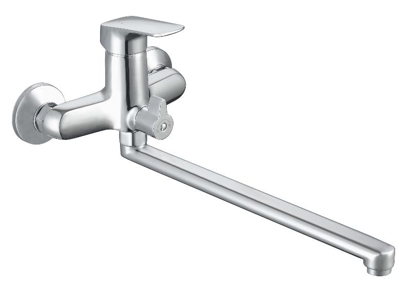 благодаря длинному изливу, возможность использоватьодновременно для ванны и раковины; однорычажная система регулировки силы струи и температуры воды; цельный корпус смесителя снижает вероятность протечек; поворотный переключатель на душ; лейка и шланг в комплект не входят;