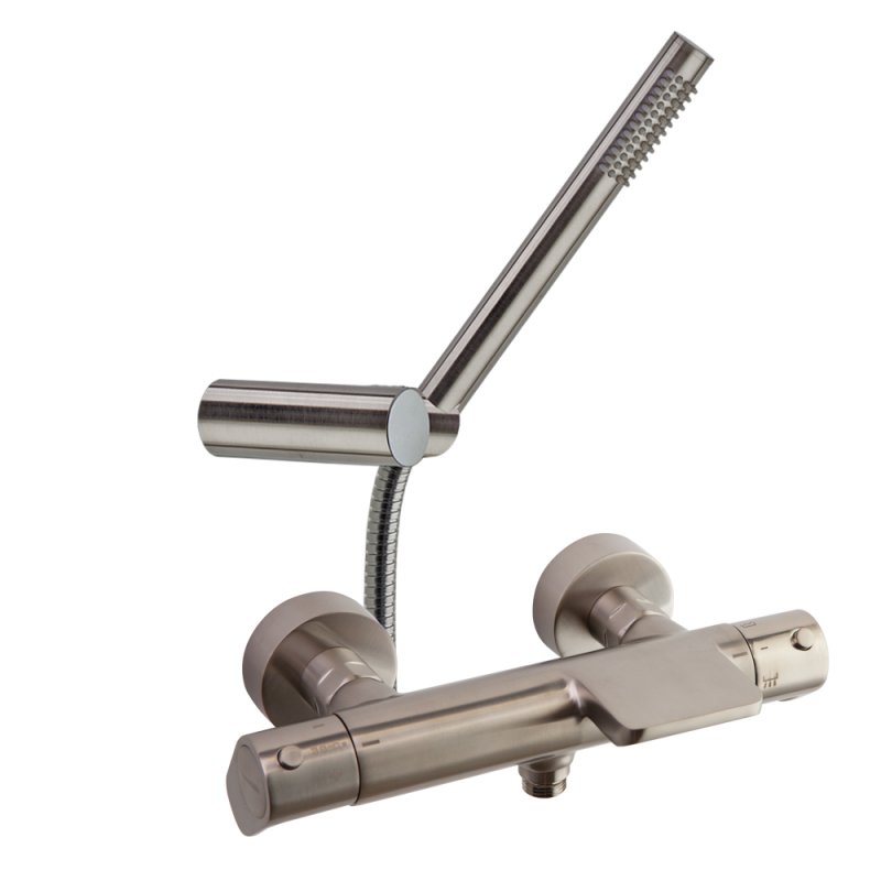 Термостатический смеситель для ванны наружнего монтажа с каскадным изливом и душевым комплектом 363901DNC ALEXIA никель брашированный