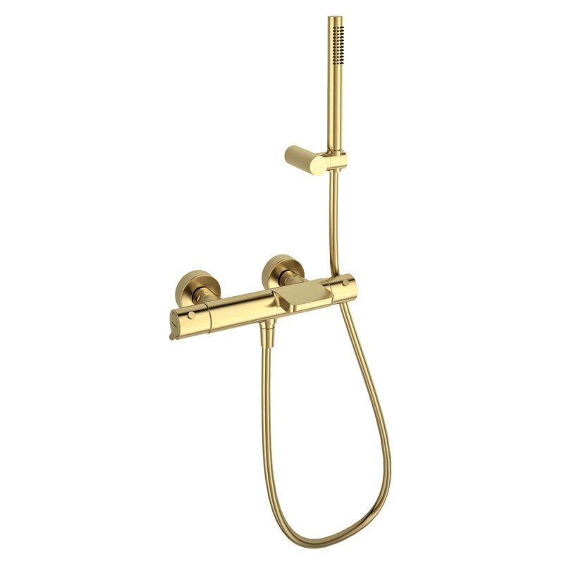 Термостатический смеситель для ванны наружнего монтажа с каскадным изливом и душевым комплектом ODISEA 393901DOC золото брашированное