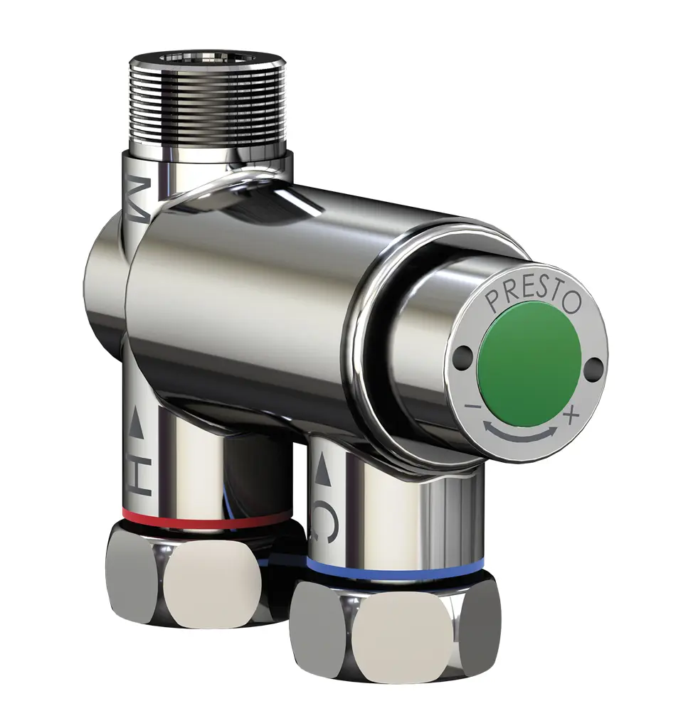 Мини предохранительный термостатический смесительный клапан для одной точки использования для умывальника или душевого крана. Ref. PRESTO "Minitherm" 29008 или технический эквивалент. С