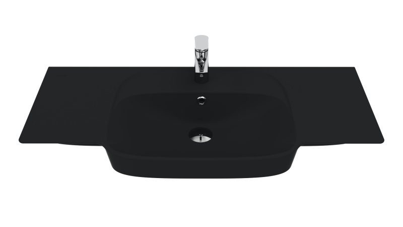 Модель предназначена для накладного монтажа на мебель или столешницу, что облегчает установку и позволяет создавать чистый, современный интерьер. Отсутствие заводских отверстий под смеситель дает полную свободу выбора сантехнической арматуры, позволяя подобрать оптимальный стиль и функционал под индивидуальные предпочтения. Черное матовое покрытие не только создает эффектную визуальную глубину, но и практично — оно устойчиво к царапинам, пятнам и легко очищается от загрязнений.