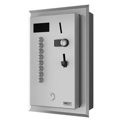 Встроенный монетный и жетонный автомат для 2-8 или 12 душа, интерактивное управление, выбор душа пользователем -Гигиенический смыв -Антивандальное исполнение -Выбор душа пользователем перед использованием монеты или жетона пользователь нажимает кнопку и таким образом выбирает душ, на дисплее покажется номер душа -Интерактивное управление-пользователь может выключать и включать воду пьезо кнопкой прямо в душе -За 30 сек. перед окончанием подачи воды пользователь предупреждается прерывистой подачей воды -Индекс Z – монтаж в стену -Настройка параметров при помощи пульта дистанционного управления SLD 05 (настройка времени пуска душа в соответствии с величиной монеты или жетона, настройка срока задержки включения, возможность активации гигиенического смыва, настройка стоимости времени, актуальный курс EUR, настройка стоимости жетона, настройка контраста дисплея, возможность выключения одного из душей) -Возможность маркировки символов на кнопки по запросу -Возможность получения статистической информации, диагностика устройства -Закрывается на ключ -Материал AISI-304 -Возможно производить из AISI-316L по запросу -Матовая поверхность