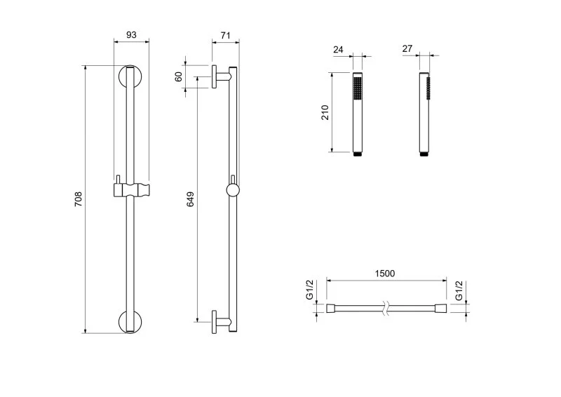 В комплекте | 1. Душевая штанга 2. Держатель душевой лейки 3. Душевая лейка 4. Душевой шланг из ПВХ 5. Монтажный комплект |