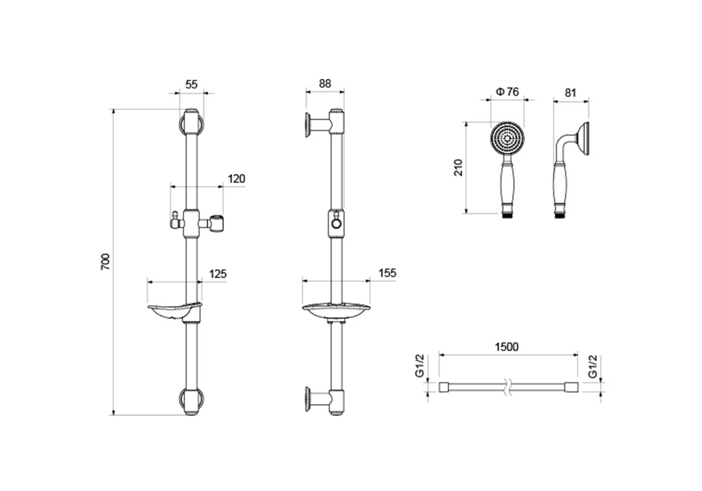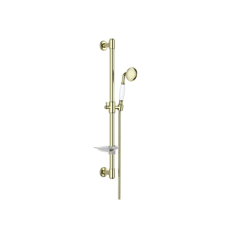 В комплекте | 1. Душевая штанга 2. Держатель душевой лейки из латуни 3. Душевая лейка 4. Душевой шланг 5. Мыльница 6. Монтажный комплект |