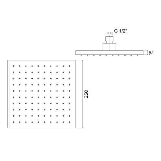 Верхний душ квадратной формы 250x250 мм из пластика ABS с матовым черным покрытием (YO, соответствует нормам EN1982 для контакта с водой, антикоррозийная стойкость), толщиной ~25 мм; фиксированный тип с одним видом струи (мягкий дождь), стандарт подключения 1/2" (15x21) для настенного или потолочного монтажа. Вес 0,4 кг, выдерживает давление 1–5 бар и расход до 12 л/мин; подходит для тропического или стандартного душа. Производство Paini (Италия), артикул 50YO759Q25ABS, гарантия 2 года; сертификация CE для ванных комнат.
