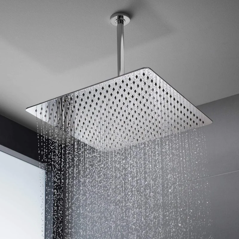 Верхняя душевая лейка (тропический душ) из нержавеющей стали 201 с хромированным покрытием, создает эффект тропического ливня с равномерным распылением. Габариты: 400x400 мм, стандартная подводка 1/2", силиконовые (или латексные) форсунки для легкого удаления накипи, расход воды ~11 л/мин, один режим струи. Производство Zeta (Китай), гарантия 1 год, форма квадратная для подвесного или потолочного монтажа в ванных от 1 м².