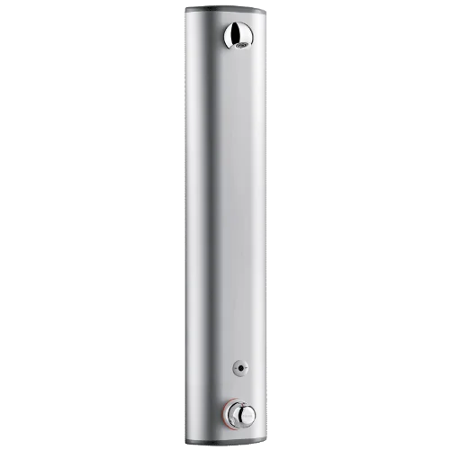Сенсорная термостатическая душевая панель представляет собой анодированную алюминиевую панель, предназначенную для наружной установки на стену. Вода подводится скрытым образом через гибкие шланги M 1/2". В панели используется термостатический смеситель SECURITHERM.