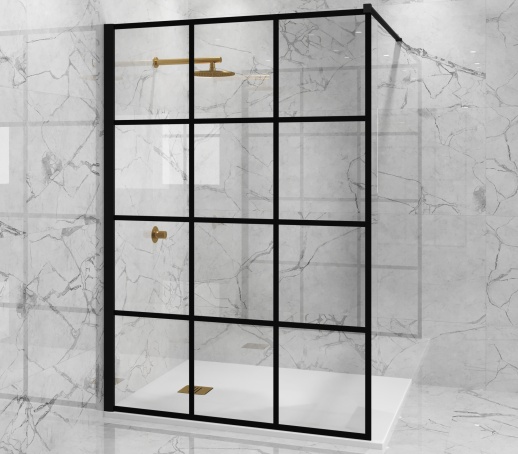 Напольная душевая перегородка из закалённого прозрачного стекла толщиной 8 мм с принтом решётка (чёрный рисунок), алюминиевый профиль чёрный матовый (анодированный); размеры 1100x1950 мм, без дверей и порогов для Walk-In стиля. Вес 48,5 кг, верхний кронштейн 1000 мм, регулировка ±20 мм; соответствует нормам безопасности для стекла в ванных. Производство Paini (Италия), артикул PAINI-WalkIN110G, гарантия 1 год; сертификация CE, прямоугольная форма для минимализма.