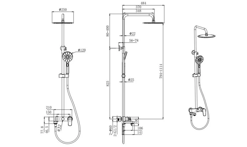В комплекте | 1. Тропический душ 2. Лейка 3. Рейлинг 4. Душевой шланг из ПВХ 5. Смеситель 6. Излив 7. S-образные эксцентрики 8. Декоративные отражатели 9. Монтажный комплект |