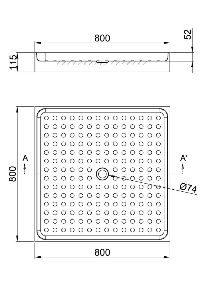 Душевой поддон 800х800 мм сделан из нержавеющей стали марки AISI 304. Предназначен для использования в помещениях. Не требует дополнительбных ножек, поскольку в качестве опоры используется корпус поддона. Слив 100 мм находится по центру изделия. Также возможно индивидуальное изготовление изделия со сливом в любой точке.