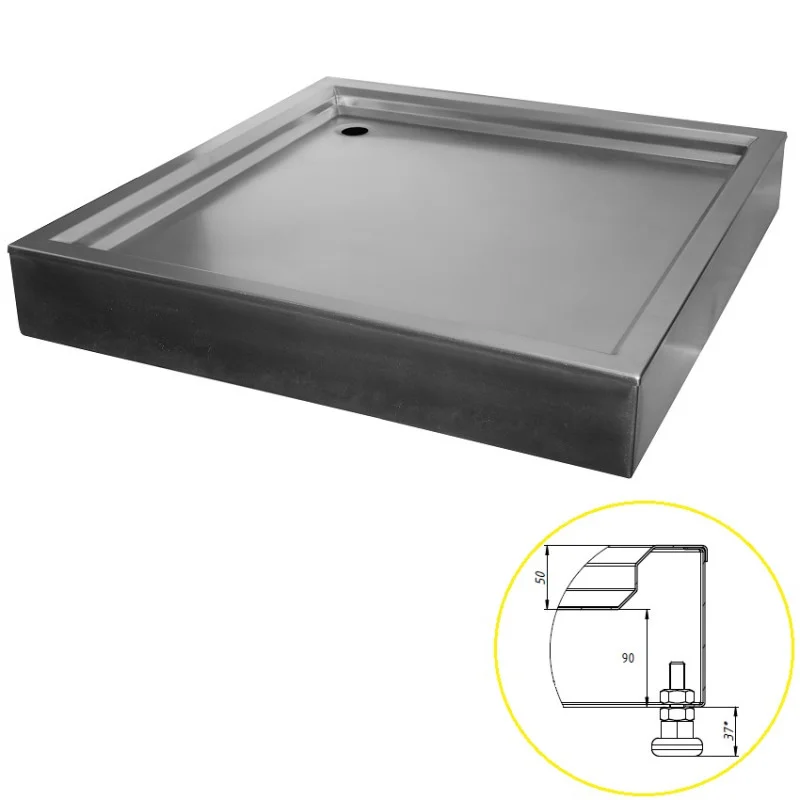 Данный поддон предназначен для использования в душевых кабинах. Он изготовлен из качественной нержавеющей стали AISI 304, толщина которой составляет 1,5 мм. Размеры поддона равны 100х100х14 см.