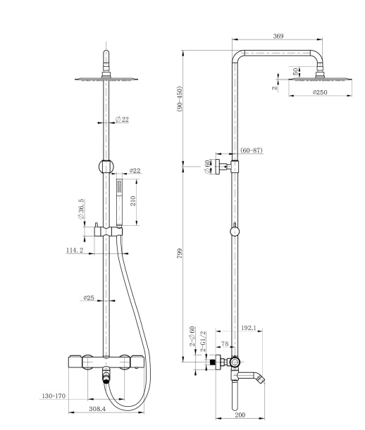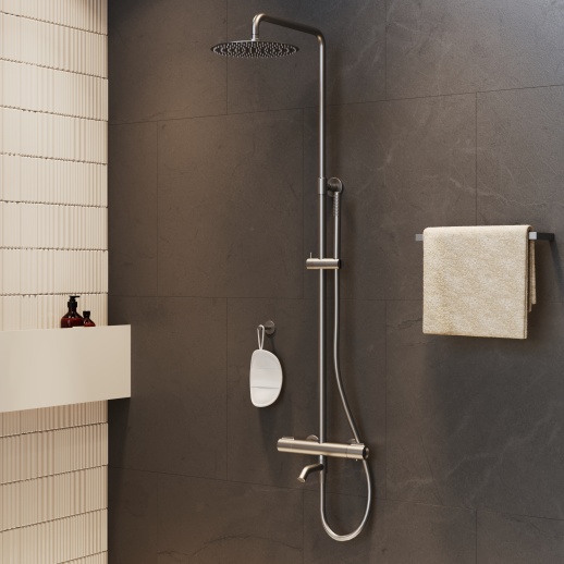 Душевая система оснащена встроенным термостатом, который поддерживает комфортную и стабильную температуру воды, защищая от резких перепадов давления и исключая риск ожогов. Технология Cool Touch предотвращает нагрев корпуса, делая использование максимально безопасным. Поворотный излив позволяет направлять поток воды как вверх, так и вниз, обеспечивая удобное переключение между верхним душем диаметром 250 мм с мягким равномерным потоком и ручной лейкой с одним режимом работы. Выбор между душевыми режимами осуществляется через встроенный дивертор в корпусе смесителя с простым и интуитивно понятным управлением.