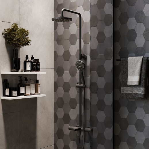 Комплект: термостат с дивертором, верхний душ, ручная лейка, шланг, держатель, штанга, излив, эксцентрики, монтажный комплект, инструкция; совместим с стандартными системами водоснабжения в ванных от 1.5 м², настенный монтаж на плитку/бетон. Отличается встроенным дивертором для переключения (верхний душ/лейка/излив) от базовых термостатов, превосходя пластиковые по стойкости к коррозии и химии в высокой влажности; округлая геометрическая форма в стиле минимализма, подходит для комплекта с черными аксессуарами Paini.