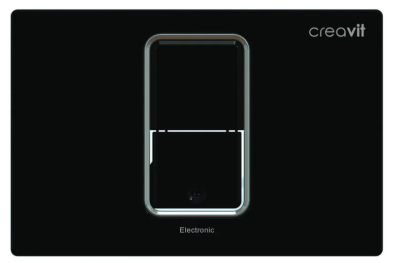 Кнопка смыва Creavit FP8002.02 — современное сенсорное устройство в элегантном черном матовом цвете, работающее от батар…